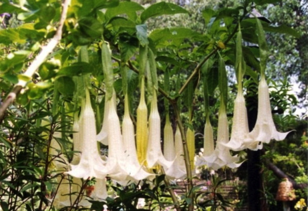 you-drunk” tree. This plant blooms with deceptively beautiful white and yellow flowers.
